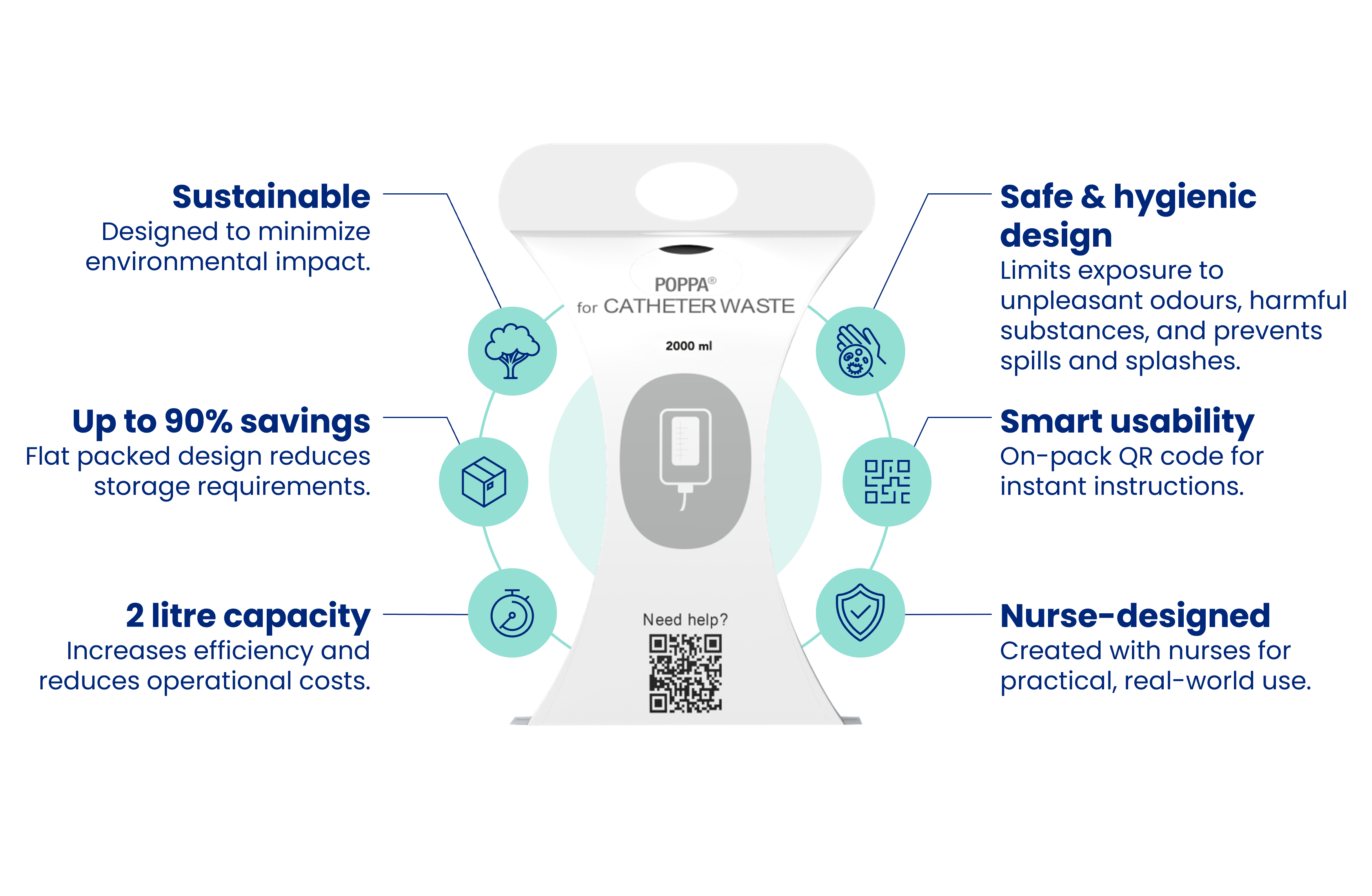 POPPA® for Catheter Waste is the first catheter waste product with pop-up technology. Use this product with an absorbent powder for solidifying liquids (e.g. Vernagel or Solidsafe) to safely empty catheter bags of up to 2 litres in capacity.