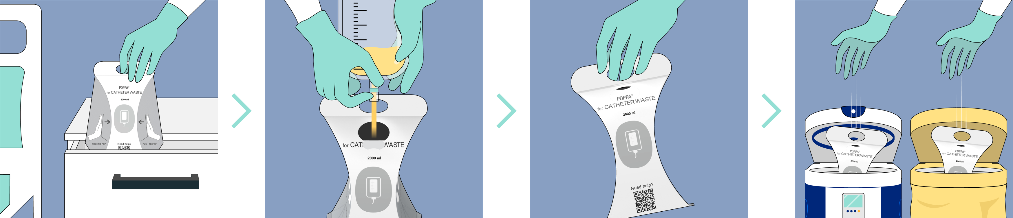 POPPA® for Catheter Waste, combined with an absorbent powder for solidifying liquids (e.g. Vernagel or Solidsafe), is able to empty catheter bags of up to 2 litres. The solidified contents can be quickly and safely disposed of or macerated afterwards.